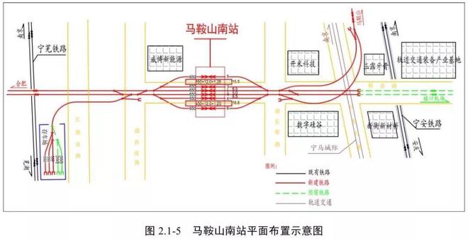 根据此前公布的环评,马鞍山南站整体以高架站房建于银黄路的上方,2座岛式站台共4个站台面及6条铁路线也全部位于银黄路上方,设有南北两个站前广场。同时,马鞍山南站西侧宁芜铁路旁还建有存车场,满足马鞍山南站始发终到需求。