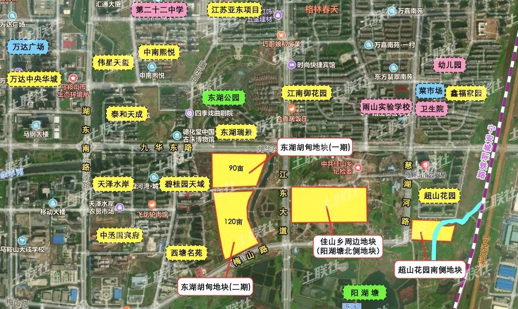 东湖胡甸地块、佳山乡周边地块、超山花园南侧地块均位于雨山区九华东路南侧、宁安城际铁路西侧。3宗地块紧邻主城核心区,地块周边商业、教育、医疗、交通等综合配套资源丰富,毗邻万达商圈和政务中心,区位优势明显。
